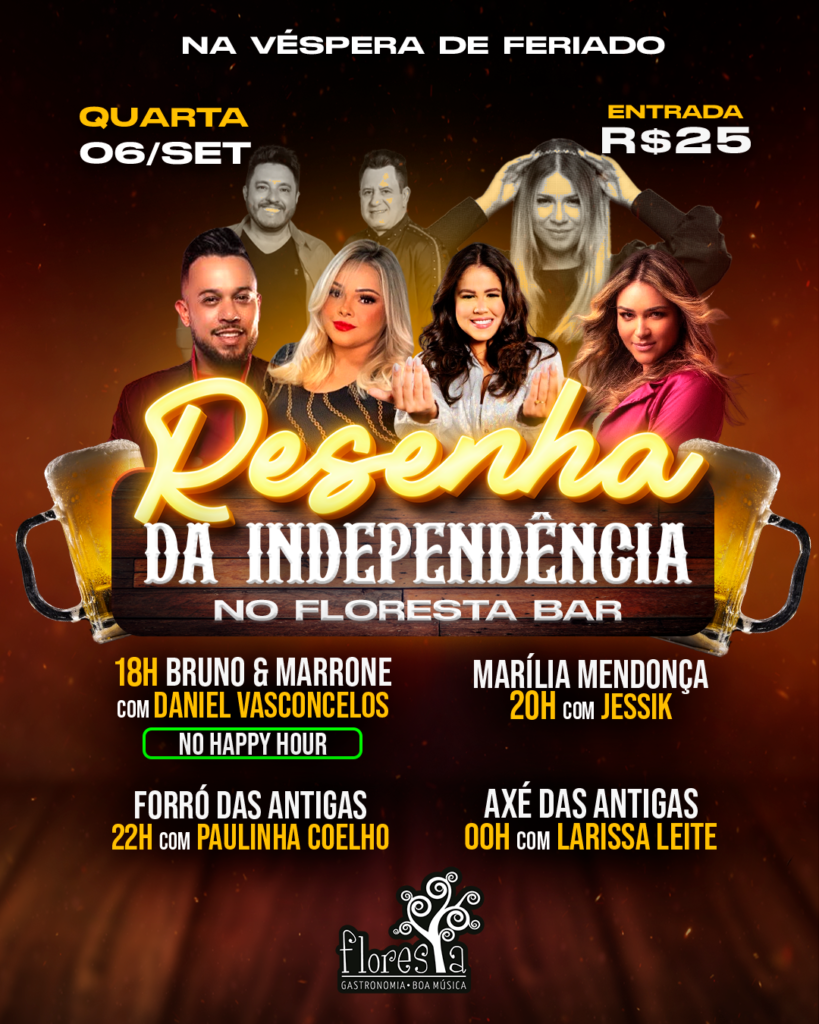 Daniel Vasconcelos – 18h, com Tributo a Bruno e Marrone Jessik – 20h, om Tributo a Marília Mendonça Paulinha Coelho – 22h, forró das antigas Larissa Leite – 00h, axé das antigas