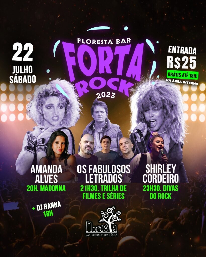 DJ Hanna – 18h Amanda Alves (Madonna) – 20h Os Fabulosos Letrados – 21:30h Shirley Cordeiro (Divas do Rock) – 23:30h